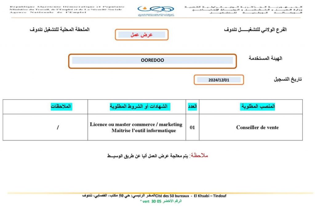 اعلان عمل في شركة أوريدو OOREDOO الجهة المعلنة: Ooredoo تاريخ النشر: 01/12/2024 مكان العمل : تندوف مستشار مبيعات 01 ليسانس أو ماستر في التجارة/ التسويق، إجادة الحاسوب