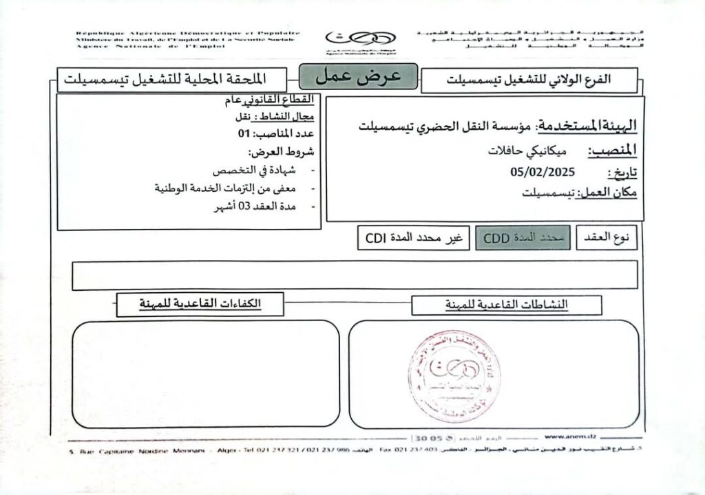 يتم معالجة عرض العمل آليًا عبر النظام المعلوماتي وسيط بالملحقة المحلية للتشغيل تيسمسيلت.