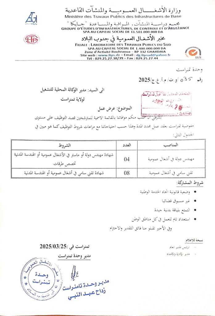 اعلان توظيف بمخبر الأشغال العمومية في جنوب البلاد