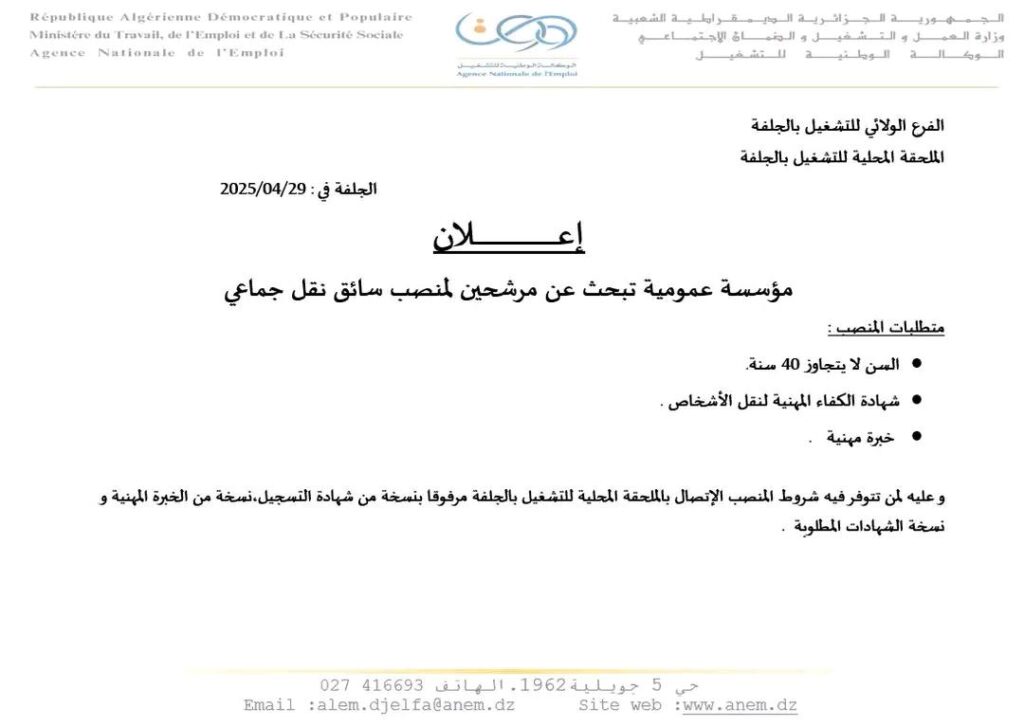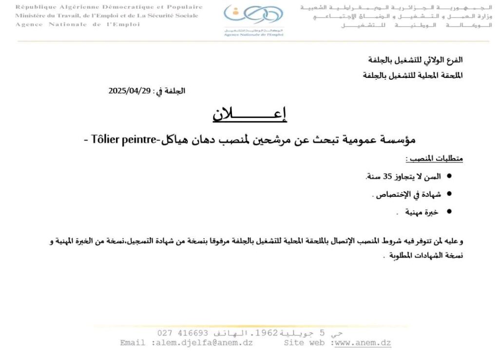 مؤسسة عمومية تبحث عن مرشحين للعمل بالجلفة